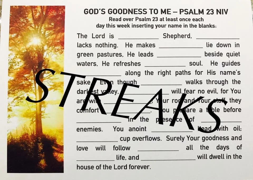 To create a "Breakthrough Streak" please recite Psalm 23 morning and night with your name in the blanks and share this to a friend asking them to do the same for 7 days. For example, " The Lord is (Jen's) shepherd. (Jen) shall not want..." Be prayerful of whose name the Lord brings to your mind to share with. surely if our kids can be consistently consistent in their silly streaks...We can do the same with a meaningful streak to renew our minds where it means the most - our faith and peace for powerful BREAKTHROUGHS in work & life! Let's DO this!